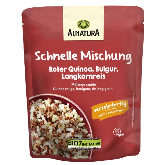 Von Salaten über Bowls bis hin zu Pfannengerichten: Mit dieser veganen Bio-Mischung aus roten Quinoasamen, Bulgur und Langkornreis gelingt eine Vielzahl an bunten Rezeptideen schnell und unkompliziert. Denn die Alnatura Schnelle Mischung Roter Quinoa, Bulgur, Langkornreis ist vorgegart, direkt aus dem Beutel verzehrfertig und kann vielfältig verfeinert werden.