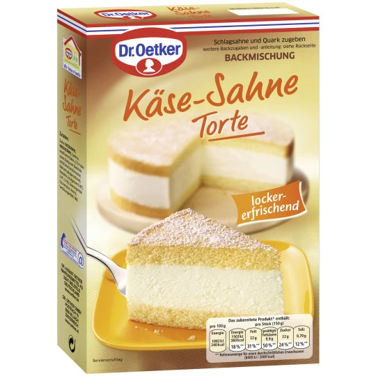 Wer kennt sie nicht, den Star jedes Kaffeekränzchens, aufgelegt als Backmischung von Dr. Oetker: Die Käse-Sahne Torte. Zarte Wiener Masse wird mit einer lockeren Creme aus frischer Sahne und Quark gefüllt, die einen Hauch von Zitrone trägt.