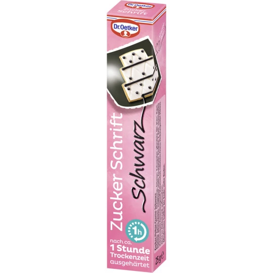 Mit der Dr. Oetker Zuckerschrift Schwarz können Sie Ihre Plätzchen, Kuchen und Torten kreativ und einzigartig verzieren und beschriften. Nach ca. 1 Stunde Trockenzeit härtet die Zuckerschrift aus und verzierte Gebäcke können gestapelt werden. So macht das individuelle Dekorieren noch mehr Spaß!