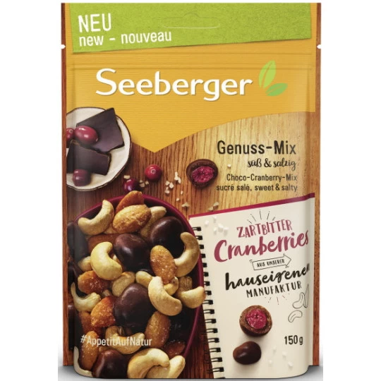In unserer hauseigenen Schokolierung werden die fruchtig-säuerlichen Cranberries aus Kanada sorgfältig in ihren knackigen Mantel aus belgischer Zartbitterschokolade gehüllt. Das einzigartige Zusammenspiel aus Zartbitter-Cranberries, Cashews und Honig-Salz-Mandeln macht den Seeberger Genuss-Mix zu einem besonderen Geschmackserlebnis für alle Nuss- und Schokoladen-Fans.