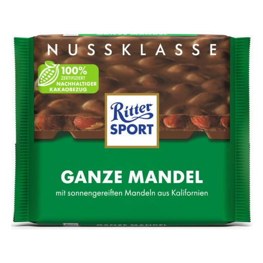 Mit der Ritter Sport Ganze Mandel holst du dir ein sonniges Gefühl direkt in deinen Bauch! Denn die leckeren Mandeln sind nicht nur knackig geröstet, sondern zuvor auch lange Zeit unter der kalifornischen Sonne gereift. Umhüllt von klassischer Vollmilchschokolade entsteht so eine Kombination, bei der es einem ganz warm ums Herz wird. Eine echte Mandelikatesse eben.