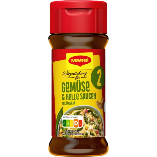 Maggi Würzmischung für Gemüse und helle Saucen unterstreicht den feinen Geschmack leckerer Kartoffel- und Gemüsegerichte. Sie basiert auf fein-herber, aromatischer Muskatnuss und wird abgerundet mit Koriander, Knoblauch, weißem Pfeffer, Lorbeer und etwas Kurkuma.